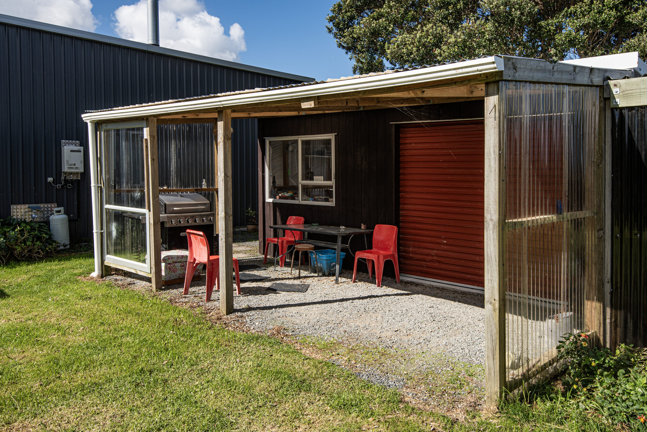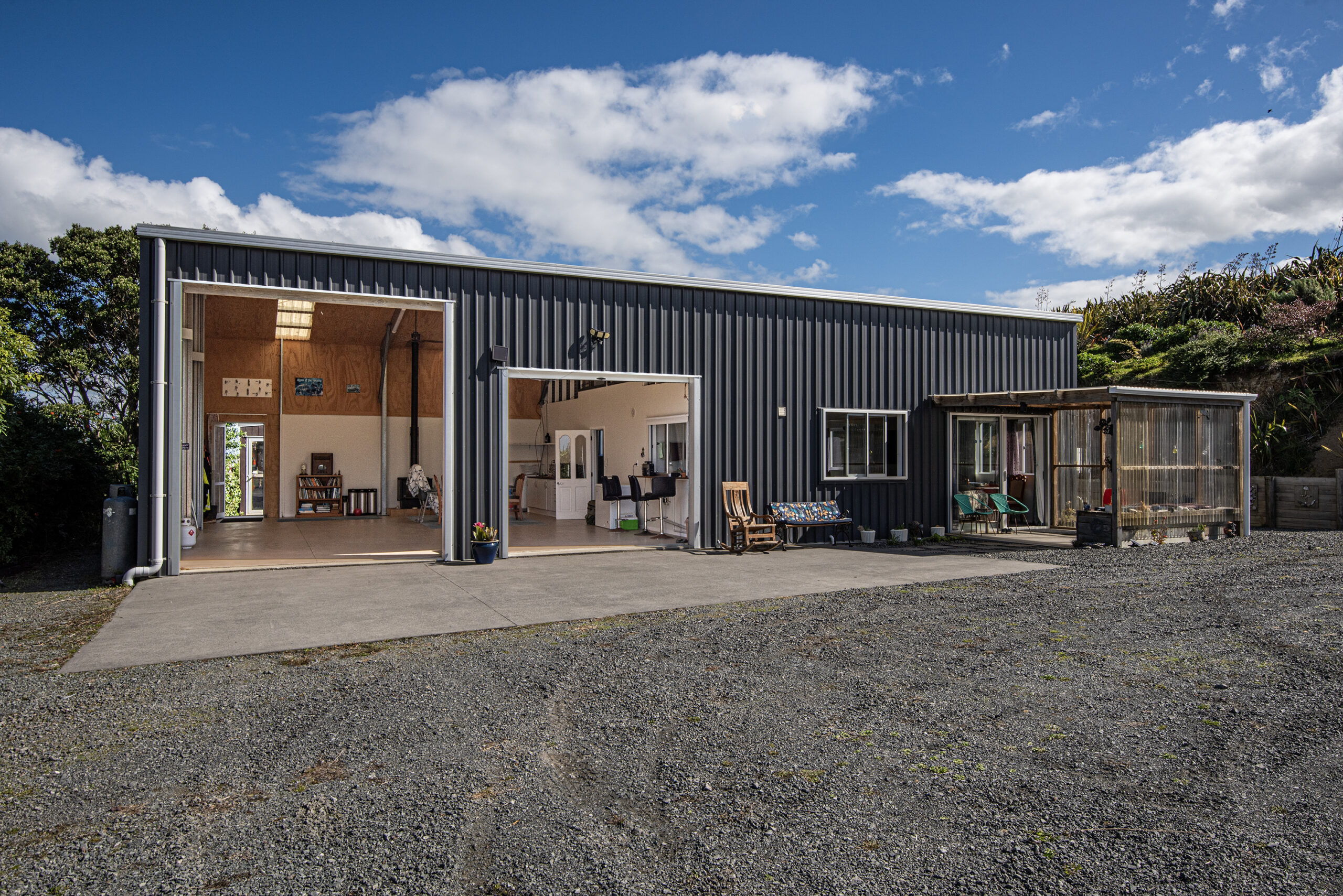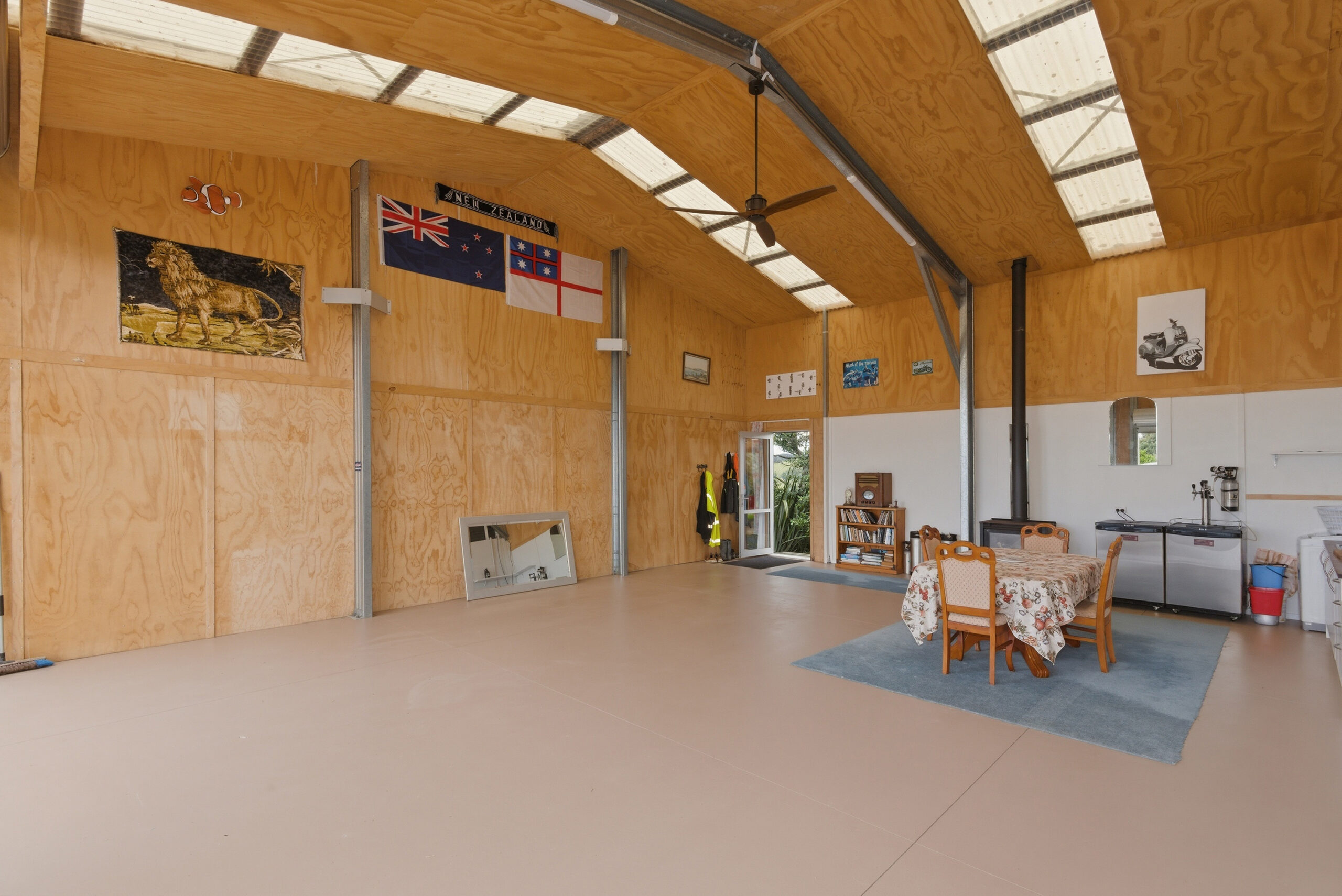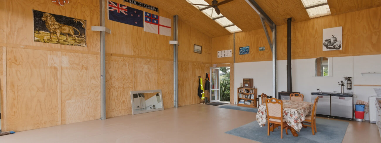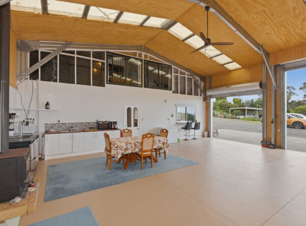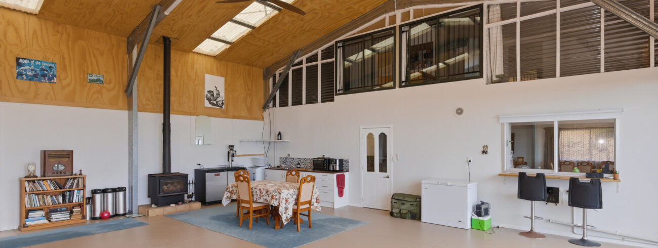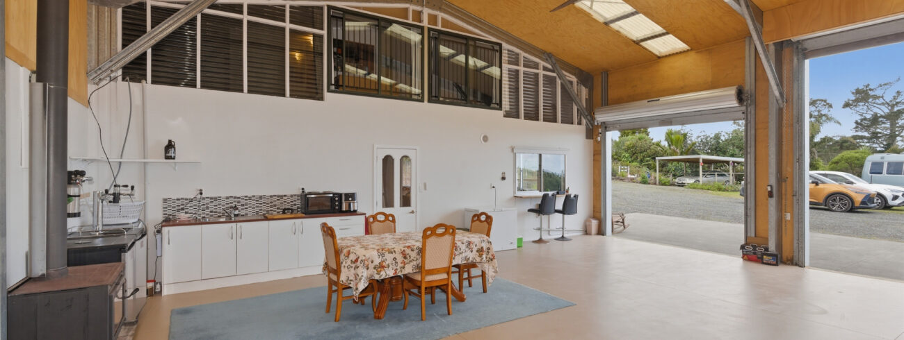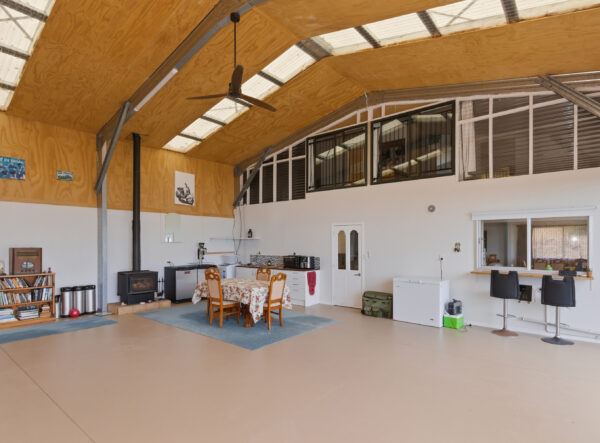 The shed features a well-designed layout, boasting a building area of 160sqm (more or less) with a mezzanine floor. The internal layout of the shed is UNCONSENTED, however inside, you’ll find a combined lounge and dining area that creates a warm and open space for entertaining or relaxing with loved ones. The kitchen is functional and makes meal preparation a breeze and it includes a cooktop, rangehood & dishwasher (no oven).