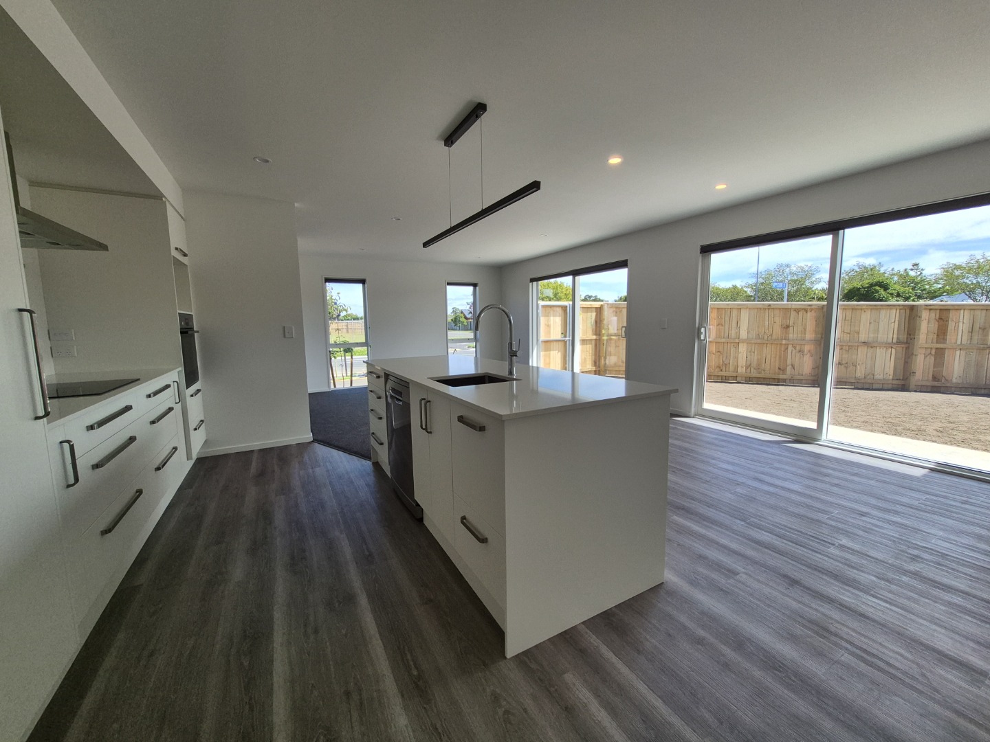 Sunny open plan living/dining/kitchen spaces.
