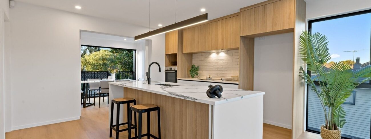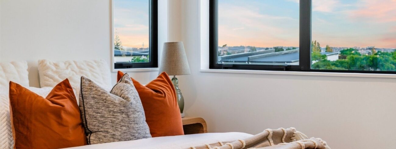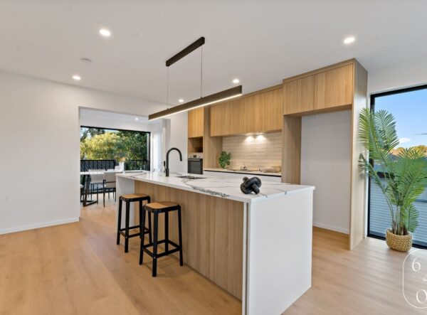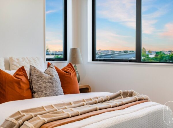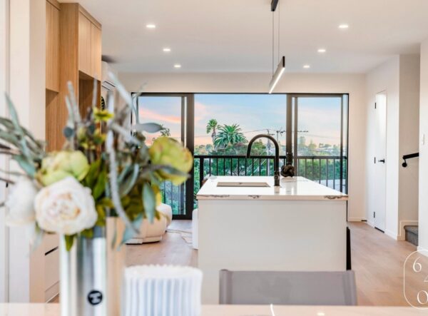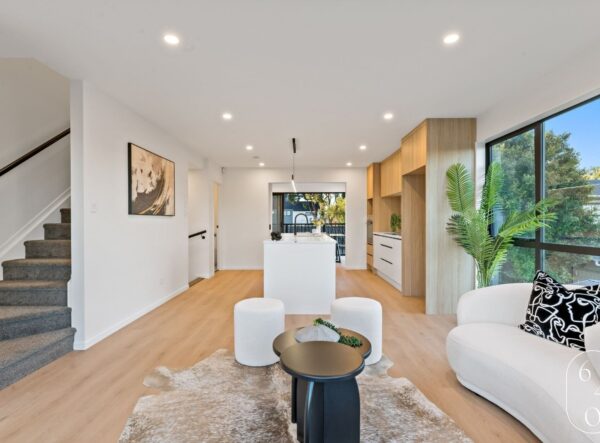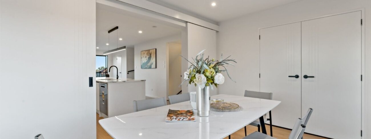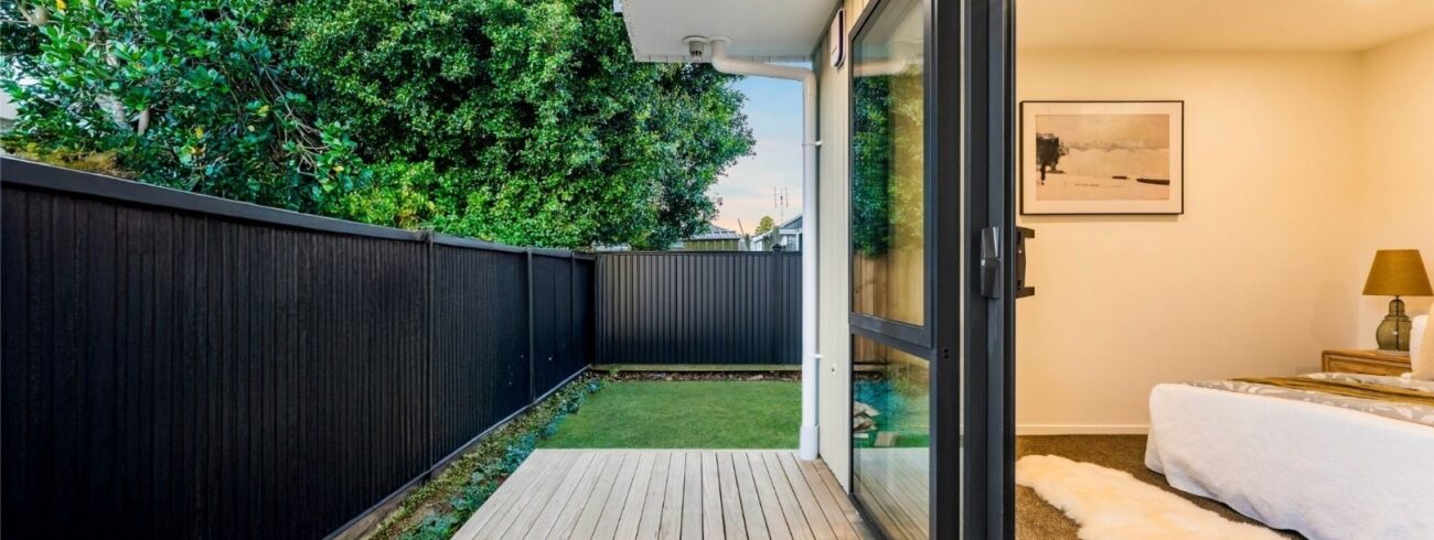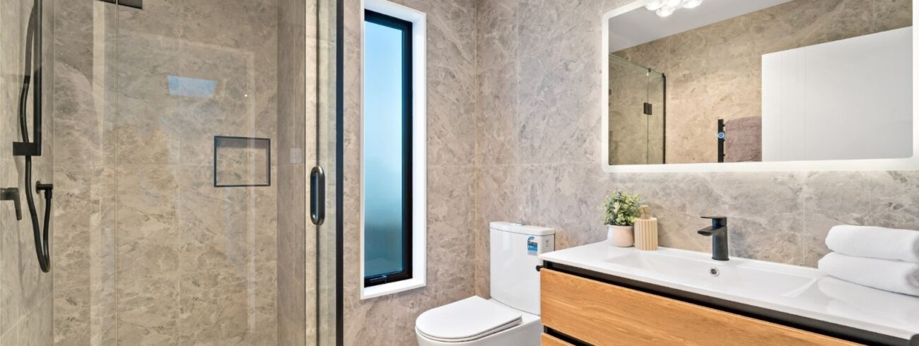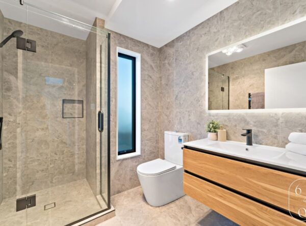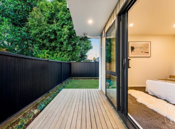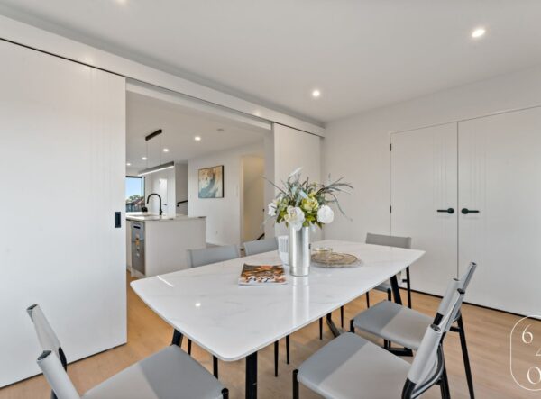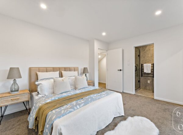 This newly built four-bedroom unit in Auckland combines modern design with practical living. Two spacious bedrooms feature ensuites, while a well-appointed main bathroom serves the remaining two bedrooms.