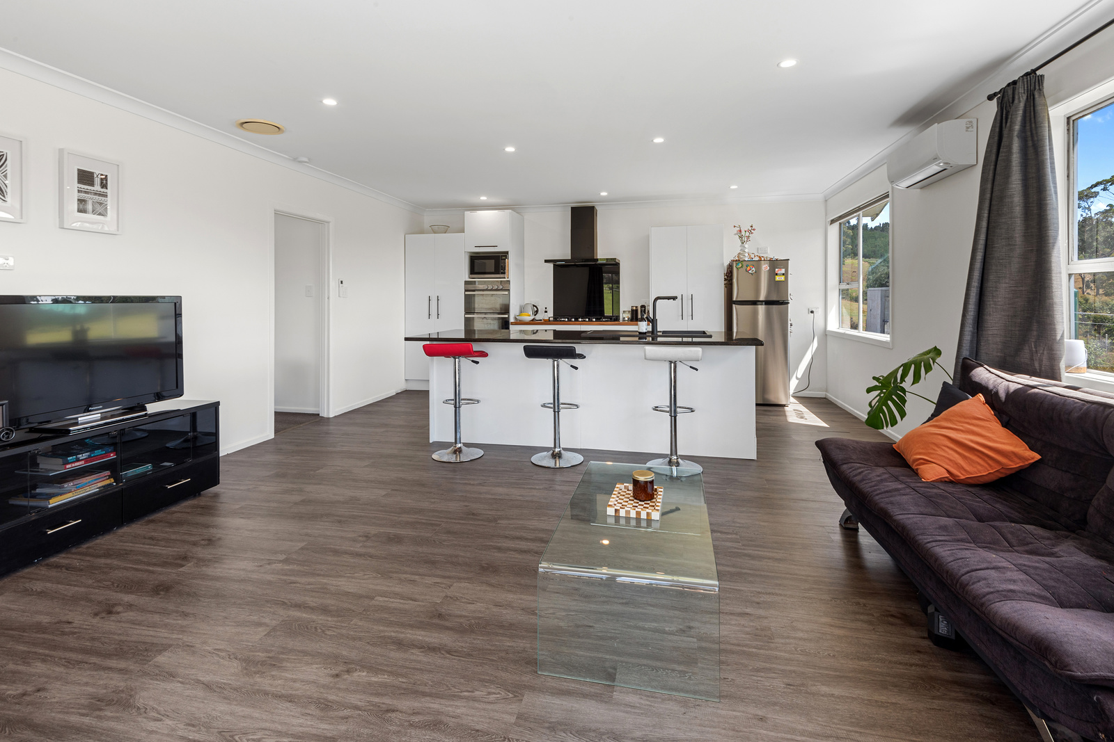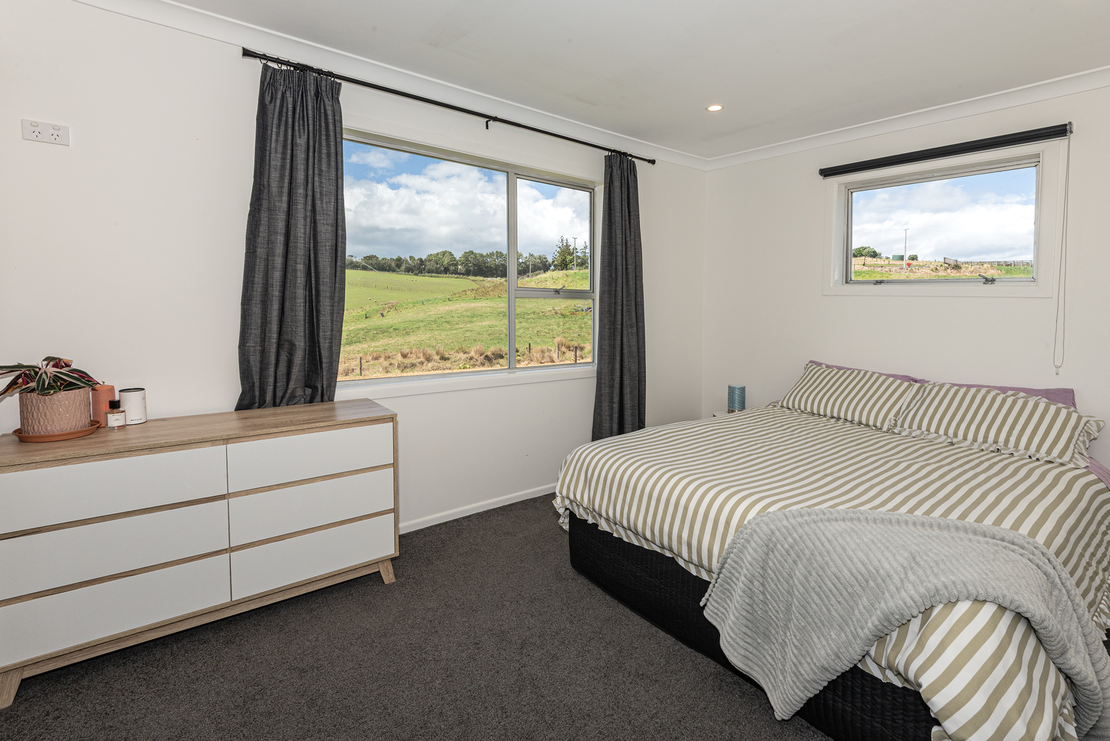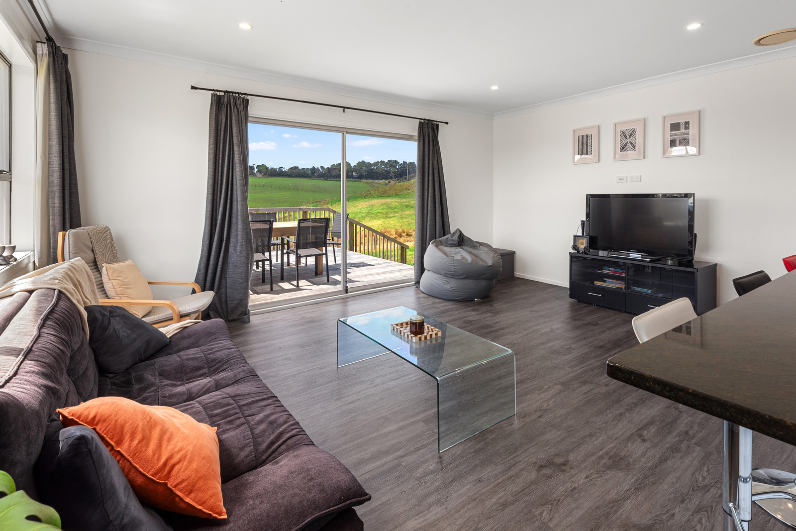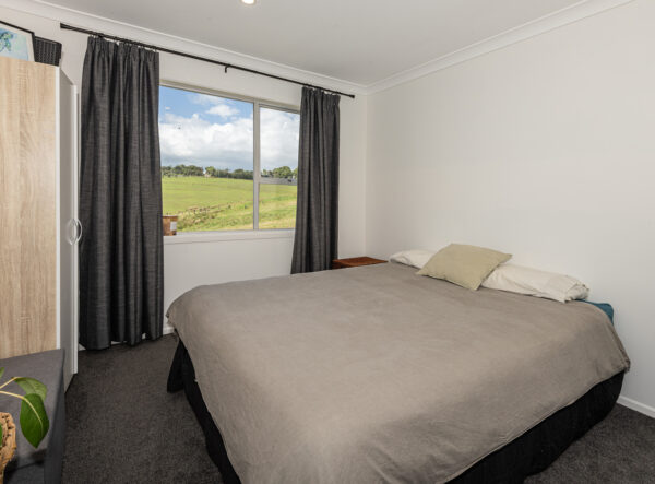 The modern kitchen is equipped with high-quality appliances, including a wall oven, gas cooktop, and rangehood, complemented by a stylish granite breakfast bar. The combined lounge and dining area are bathed in natural light, offering relaxing views of the surrounding countryside. A heap pump keeps you warm all year round.
