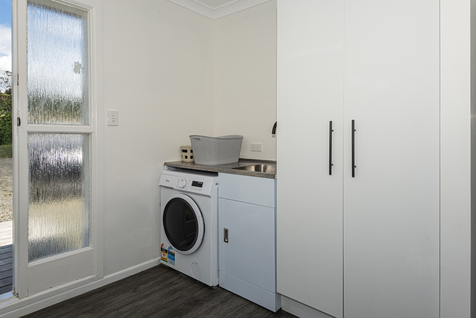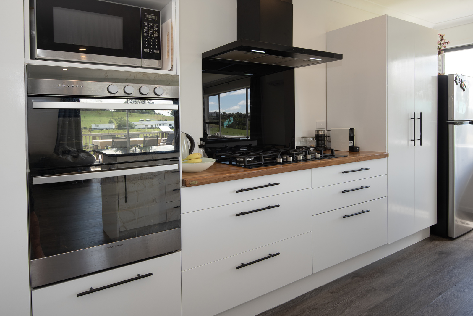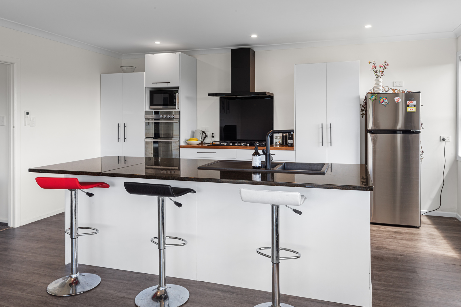 The modern kitchen is equipped with high-quality appliances, including a wall oven, gas cooktop, and rangehood, complemented by a stylish granite breakfast bar. The combined lounge and dining area are bathed in natural light, offering relaxing views of the surrounding countryside. A heap pump keeps you warm all year round.